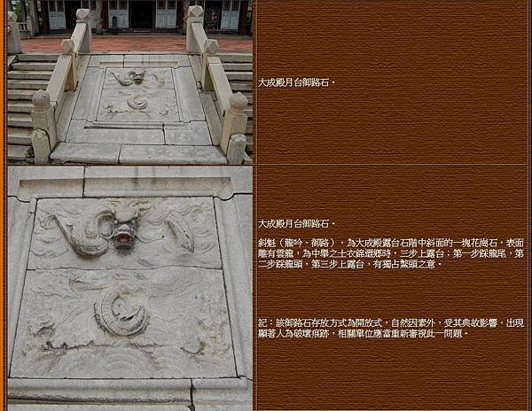 因此,重新檢討,得以下述說邏輯:在帝制之學廟合一、教政一體的制度下,朝廷所在及其他行政等級較高之孔廟,在丹墀前踏跺中龍雕石板両側仍為踏跺,構成兩條通道,非如台北或台南孔廟之只有龍雕石板、沒有通道;而排成兩列由兩側抬著皇帝御轎的轎夫們便是由這兩條通道登上丹墀的,至於皇帝則在這同時隨著御轎由龍雕石板上空越過,一同登上丹墀。因此龍雕石板以「御路」一詞稱之,是相對於轎夫所走的兩側轎夫通道而言,是特指皇帝上丹墀的専用通道...這樣看是相當合乎邏輯的。