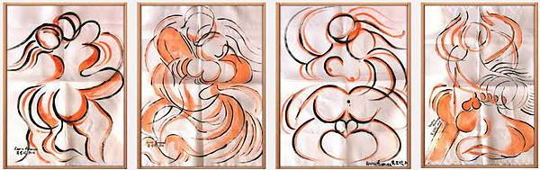 八幅作品中,或跪,或站,或仰,或翹臀,都在表現男女歡愉,甚至有一張是三種交合姿勢融合成一幅畫,包含口交。黃君欣說,她的畫作有包含立體派及未來派,雖是平面作品,但隱含動態,讓人感受交合抽動的意象。