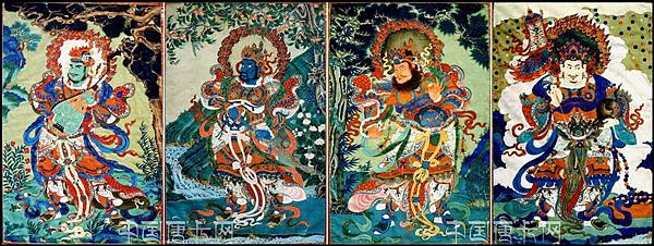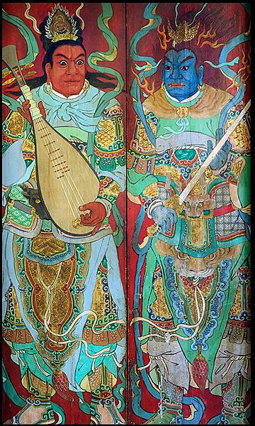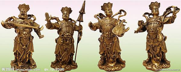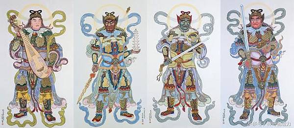 東方持國天王:持國意為慈悲為懷,保佑眾生,護持國土,故名持國天王。居須彌山黃金地,身為白色,穿甲胄,手持琵琶,是主樂神,表明他要用音樂來使眾生皈依佛教,他負責守護東勝神州。