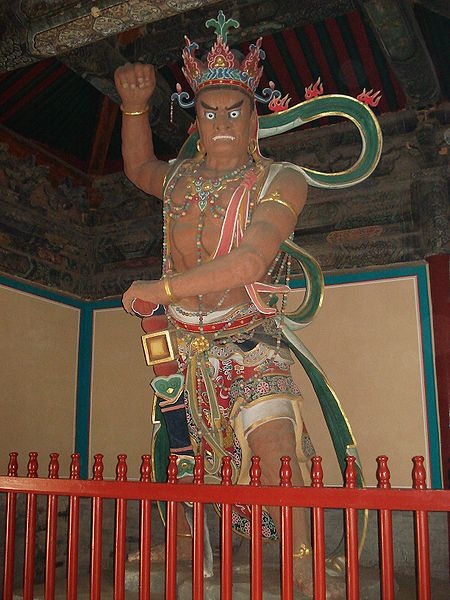 的意思。西方廣目天王,身上纏著一條龍,有的時候是一條蛇,蛇跟龍是一樣的意思,代表著變化,表示這個物質世界的現實社會,一切人、一切事、一切物,都是變化無常、變化多端,一定要把他看