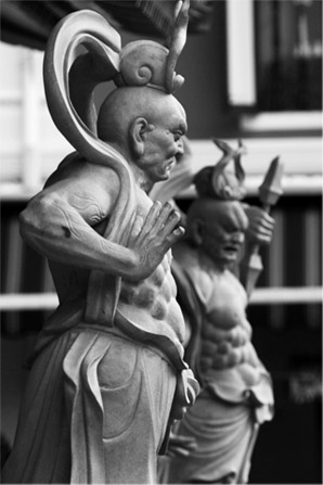 門神 門神在梵文中稱為Dvarapala,在印度教和佛教中是守護大門的脅侍,通常為人形或魔形,安置在印度教或佛教的寺院或建築的入口兩側作為守護神,造型一般上威武兇猛。按寺院的大小和財力,門神分為單尊、一對或一組等幾種類型。 - See more at: http://www.btrts.org.sg/temple-first-gate-guardian...