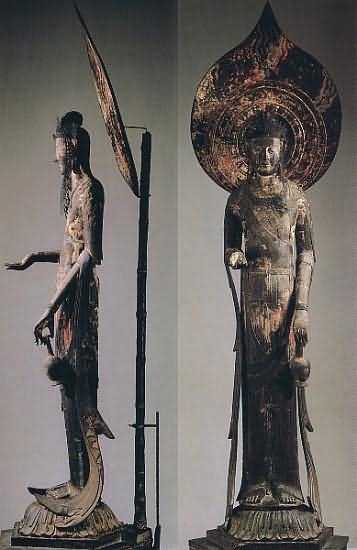 音樂使眾生皈依佛教;南方天王毗琉璃,漢譯“增長”能令他人善根增長,塑像身青色,手持寶劍,率領鳩槃荼(雍形鬼)、薛荔(餓鬼)諸神將,保護南方閻浮提洲人民,手中寶劍,用來保護佛法,