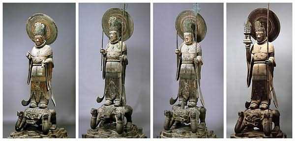 南方增長天王:增長意為能令眾生增長善根,護持佛法,故名增長天王。居須彌山琉璃地,身為青色,穿甲胄,手握寶劍,以保護佛法不受侵犯,他負責守護南瞻部洲。西方廣目天王:廣目意為能以淨