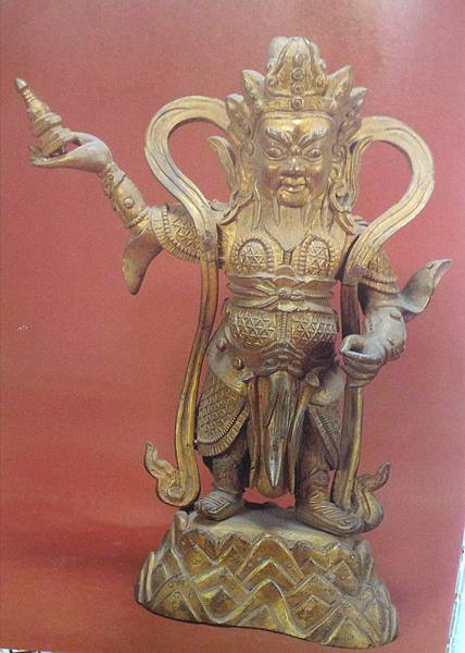 北方多聞天王:又名毗沙門,「多聞」意為頗精通佛法,以福、德聞於四方。住須彌山黃金埵,身為綠色,穿甲冑,右持寶傘(或作寶幡),左手臥神鼠-銀鼠。用以制服魔眾,護持人民財富。又名施財天,是古印度的財神。他負責守護北俱蘆洲,以 夜叉、羅剎、阿修羅...為多聞天王的部眾. 是『二十諸天』中的第三天王。