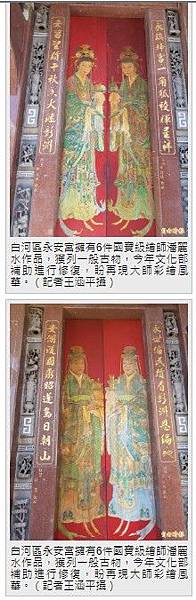 已有47年歷史的白河永安宮「潘麗水門神彩繪」,經古物審議委員會審議,認為極具時代特色,能表現傳統、族群與地方文化特色,且深具藝術造詣成就,獲與會委員一致通過,依據《文化資產保存法》第65條指定為台南市一般古物。