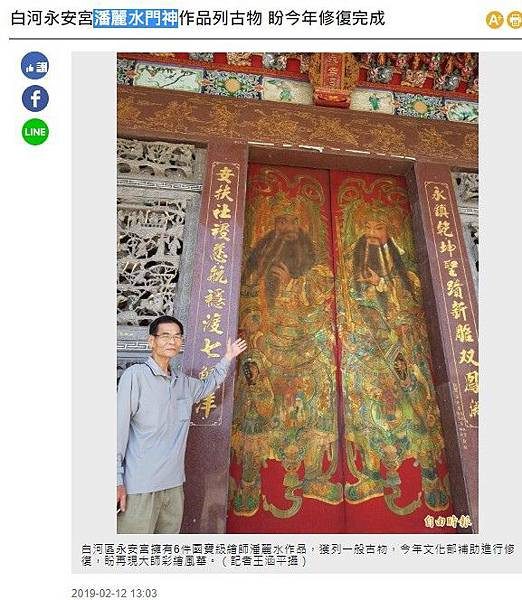 分享白河永安宮潘麗水門神作品列古物 盼今年修復完成到Facebook 分享白河永安宮潘麗水門神作品列古物 盼今年修復完成到Line
