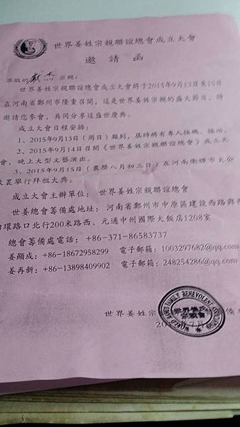 世界姜姓宗親聯誼總會成立大會(籌委會)通知