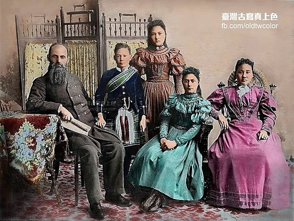一直都知道馬偕死後葬在臺灣,原來不只是馬偕,而是他全家都選擇葬在臺灣。圖:著蘇格蘭傳統服裝的馬偕博士全家照(經手繪數位上色)。左起馬偕、獨子偕叡廉、次女偕以利、長女偕瑪連、夫人張聰明。兩個女兒都嫁給臺灣人,獨子偕叡廉在遠赴加拿大完成學業後也返臺宣教並創辦淡水中學校(今淡江高中前身),全家人過世後都葬在淡水。