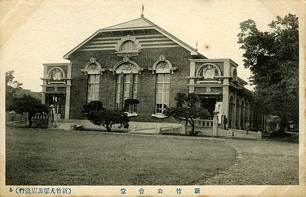 新竹畫家鄭世璠有幅關於公會堂的水彩畫,就是呈現當時公會堂遭炸毀後滿目瘡痍的慘狀。1947年3月,有鑑於新竹還是需要個公眾集會的地方,於是就原公會堂進行復原的工程,該計畫從是年10月份起,花費了整整一年的時間才完工,原有的公會堂係紅磚白飾帶的式樣建築,有著總督重要工程師松山森之助的風格,正立面屋頂有切角頂背心式(jerkinhead roof,日本稱此為「半切妻」)結構,左右各有衛塔,衛塔上的牆飾為灰泥作成的勳章飾;背立面屋頂採「入母屋」即歇山的形式,總體雍容華貴,歐風洋味十足。
