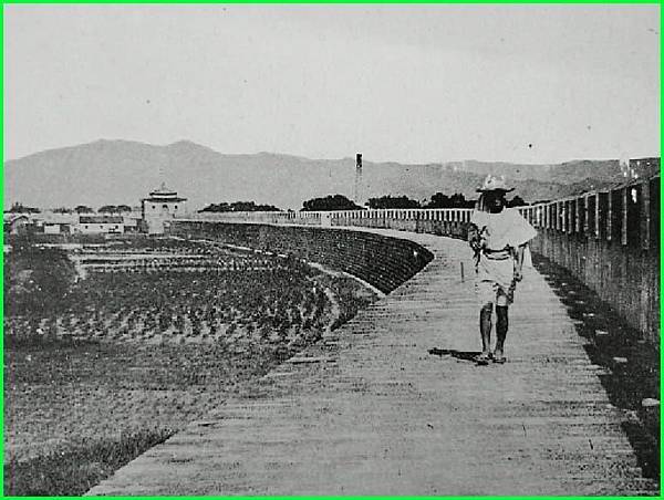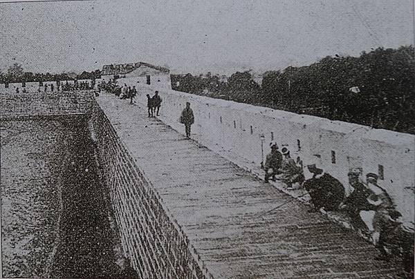 這個城牆的城垛大小還有城門的結構看不到燕尾型式,另外一旁似乎是小山坡,不太肯定是台北城南門‧(附圖遠方是大南門)