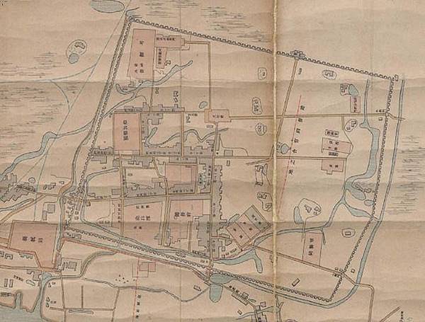 應是從大南門往東向城牆拍過去。那城牆角落,就是現中山南路愛國西路口。再參考1897年台北城地圖就可查出位置