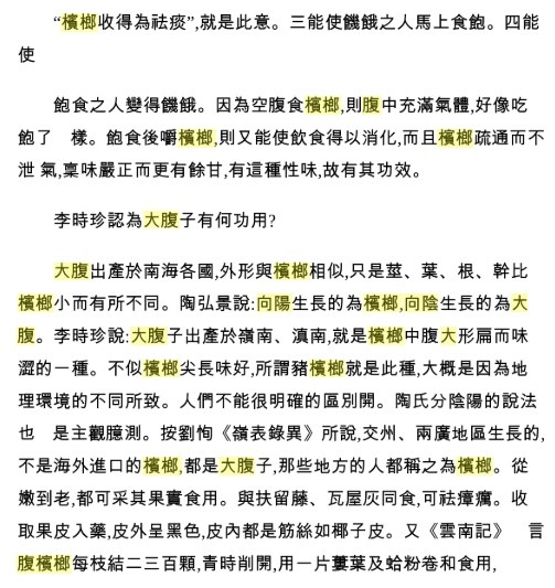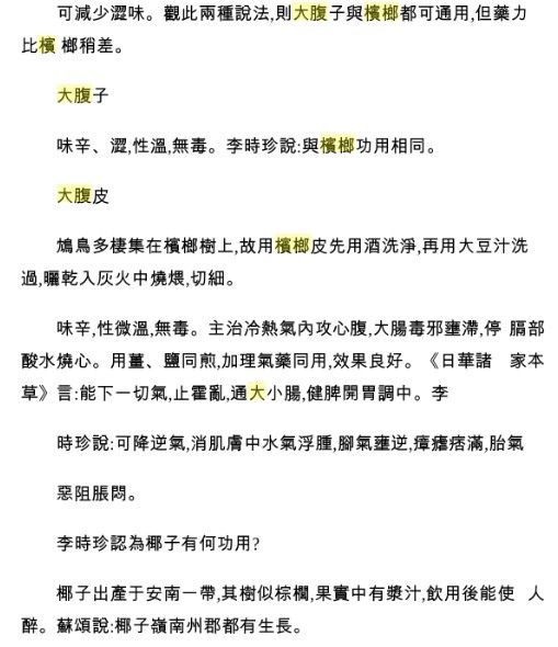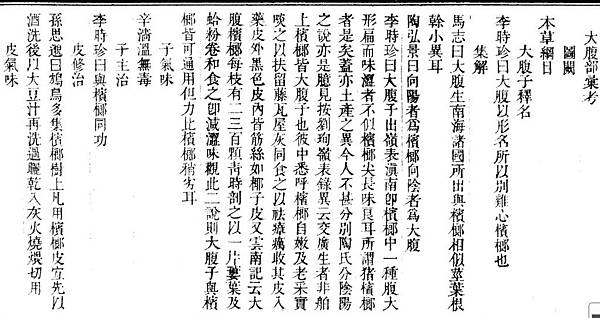 李時珍曰:大腹子,出嶺表、滇南。即檳榔中一種,腹大, 形扁,而味澀者,不似檳榔尖長,味良耳。所謂豬檳榔 者是矣。蓋亦土產之異,今人不甚分別。陶氏分陰陽 之說,亦是臆見,按劉珣《嶺表錄異》云:交廣生者,非舶 上檳榔,皆大腹子也。彼中悉呼檳榔,自嫩及老,采實 啖之,以扶留藤、瓦屋灰同食之,以祛瘴癘。收其皮,入 藥。皮外黑色,皮內皆筋絲,如椰子皮。又《雲南記》云:大 腹檳榔,每枝有二三百顆,青時部之,以一片蔞葉,及 蛤粉卷,和食之,即減澀味。觀此二說,則大腹子與檳 榔,皆可通用。但力比檳榔稍劣耳。