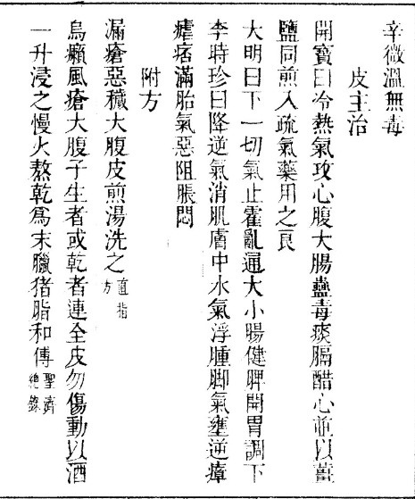 漏瘡,惡穢大腹,皮煎湯洗之。〈直指方〉