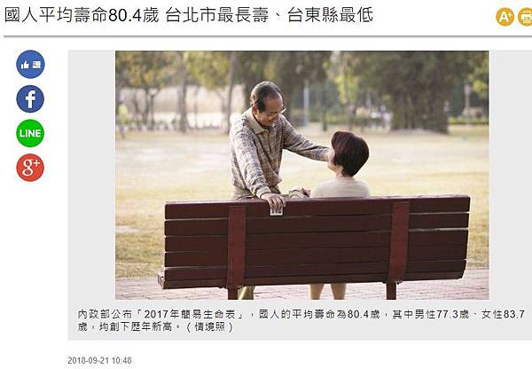 分享國人平均壽命80.4歲 台北市最長壽、台東縣最低到Facebook 分享國人平均壽命80.4歲 台北市最長壽、台東縣最低到Line 分享國人平均壽命80.4歲 台北市最長壽、台東縣最低到Google+