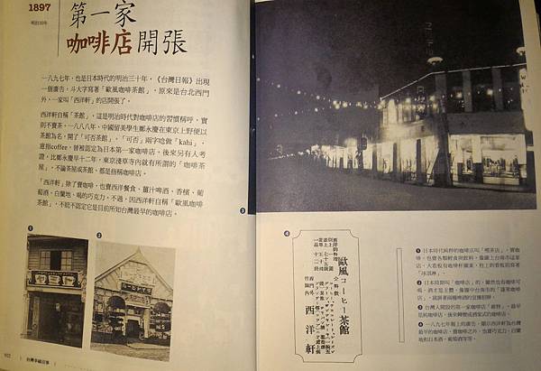 「咖啡時代:台灣咖啡館百年風騷」考證台灣咖啡館歷史,發現早在1928年,台北已存在22家咖啡館、喫茶店。1935年舉辦的台灣博覽會,甚至以「森永喫茶店」作為展示館,可見當時咖啡館的盛況。