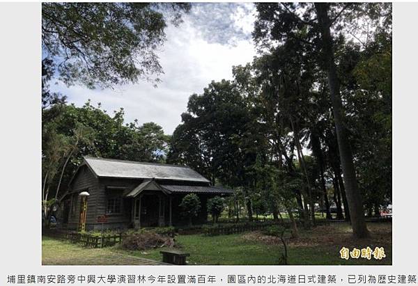 埔里鎮南安路旁的中興大學演習林,是1917年日本北海道帝國大學為進行亞熱帶林木教學研究而創設,今年滿100年,園區內早期留下的辦公場所,已被縣府列為歷史建築。