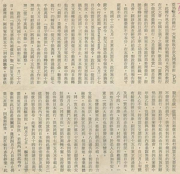 1923年9月1日直接衝擊日本政治經濟中樞的關東大地震,造成受災戶高達70餘萬戶,財物約45億圓的損失。當時日本政府的一般財政規模也不過20餘億圓,可見其損害規模之大。除了企業的生產設備受到重創,銀行更處於既難以收回貸款,又得面臨現有存款被大量提領的窘境。日本政府為恢復並促進金融的流通,特別就地震造成無法兌現流通的金融票據,以敕令第424號「震災手形割引損失補償令」,命令日本銀行以再貼現的方式融通資金。