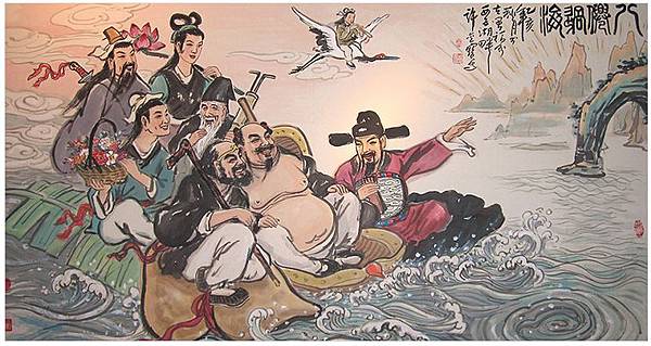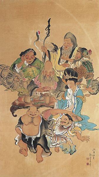 年年正月的“初詣”是說這一年第一次去寺院或神社參拜。電車上會掛起許多廣告,初詣到某某神社、到某某寺廟。商品化的時代,神佛們也要展開競爭方能生存。這時你常常會看到“遍遊某地七福神廟”的廣告。中國人常說八仙,八仙是居住在蓬萊仙島,說起方位只說,海上有仙山,隱在雲霧間。來了一看,東瀛有四島,仙人卻只有七位,而且面生得緊,不免有幾分懷疑起來歷不明。仔細查來,原來有如下的一段緣故。