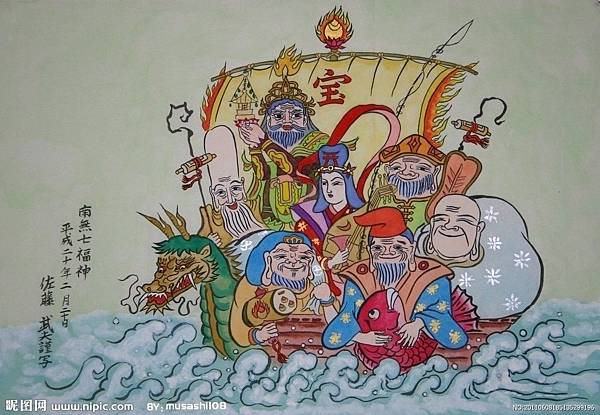 七福神聚在一起乘船而來的“寶船”的形象,是在江戶時代的中期形成的,寶船上滿載金銀和稻米包。江戶的町人們認為,過了年的第一個夢,要是夢見“寶船”,一年之間大吉大利。所以,為了過年能夢到寶船,過年以前就有人把寶船的樣子繪成圖沿街叫賣出售,過年那幾天,人們把買來的寶船圖壓在枕頭底下睡覺也就成了習慣。這個習慣在近代傳遍了全國。