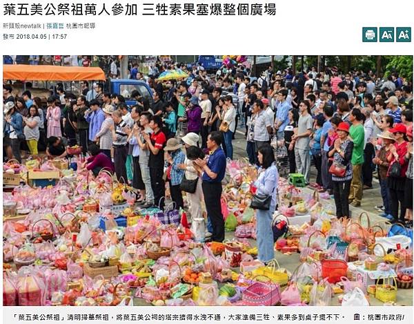 在每年清明時有近萬名葉家子孫,從全國及海外各地回到桃園新屋永興里葉五美公祖塔祭祖,代表慎終追遠、系出同源的追思之情;雖然今天炎熱且舟車勞頓,現場更擠得水洩不通,但葉家子孫們依照傳統準備三牲素果供品祭祀他們祖先。