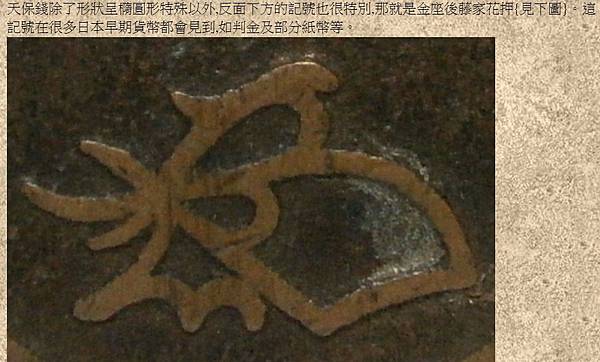 天保錢除了形狀呈橢圓形特殊以外,反面下方的記號也很特別,那就是金座後藤家花押{見下圖}。這記號在很多日本早期貨幣都會見到,如判金及部分紙幣等。