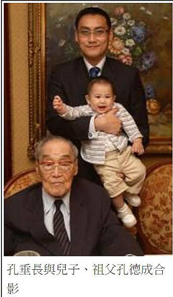 孔子第七十七代孫孔德成在一九三五年被封為大成至聖先師奉祀官,曾任考試院長,在前年過世,由於長子孔維益英年早逝,由長孫孔垂長世襲接任。