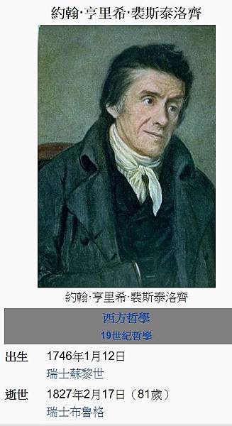 裴斯泰洛齊(1746——1827)是瑞士著名教育家,父為醫生。5歲失怙,賴慈母忠婢成長,性柔懦富於感情,及後入中學、大學,修神學而不信其說教而改學法律,又歷政界腐敗去而習農,試圖通過教育來改善農民的生活。曾在新莊、斯坦茲創辦孤兒院,從事貧苦兒童的教育。常與孤兒同寢食,共憂喜,苦心孤詣以發展兒童道德心,成效頗著。後又在布格多夫、伊佛東創辦學院,進行簡化教學實驗。認為兒童的能力由練習而發達以至於強壯;凡教育及教學均當以直觀實物為基礎;教育的進行及教材的排列,當以兒童的精神、自然的行為為準;凡為教學,當注意數目、形式和詞語三個基本要素。他根據這一原理,改進了初等學校各科教學方法。他的教育思想對近代初等教育的發展有重大影響。著作有《林哈德與葛篤德》、《葛篤德怎樣教育她的子女?》等。
