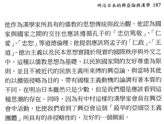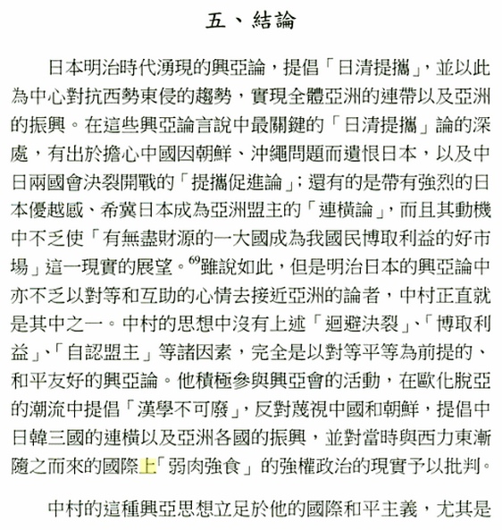 渡邊教授利用中村正直的背景與思想為例證。中村是基督徒兼儒學者,他在1871年出版的《擬泰西人上書》中,便對西方諸國以「教法為精神,以為治化之源」的益處屢屢申述,而他同時也是一位相信儒學天道觀念的學者。由此即可看出,日本的西洋觀並非可以所謂的西洋化∕西方化一筆帶過,而是具有儒家式文明觀的基礎。至於明治日本學習西方,特色是視此為追求普遍價值的實現,而非帶有恥辱感的被動模仿。