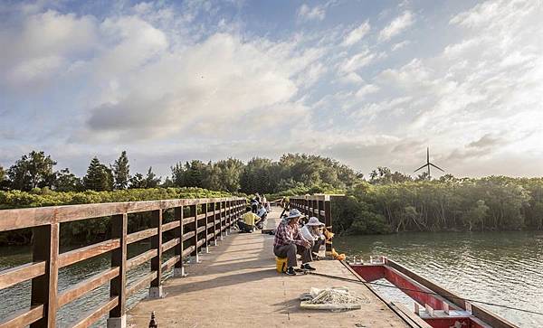新竹紅樹林生態保護區辦理「濕地生態環境教育展示設施工程」停擺,釣客在沒有欄杆的虹橋上釣魚。(羅浚濱攝)