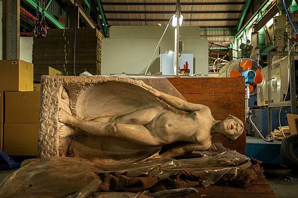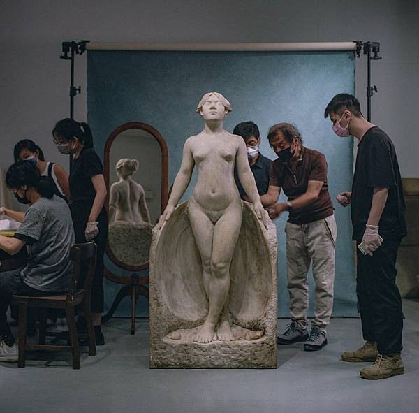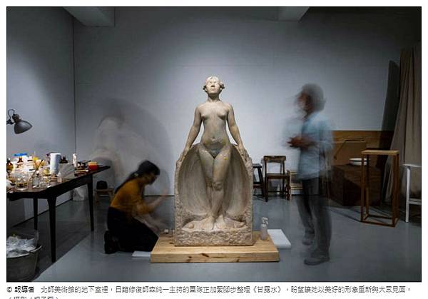 曾多次主持黃土水作品修復的森純一,同為東京藝術大學畢業,是雕塑家也是修復師的他,這一回在北師美術館的地下室,再次整理學長黃土水的《甘露水》。在雕像挪到修復空間以前,森純一見過她橫躺在木箱裡的模樣,左側身體下方甚至還有老鼠築巢的痕跡,經過近半世紀的時間,大理石也不如黑白照片中潔白,顏色泛黃並有多處髒汙。