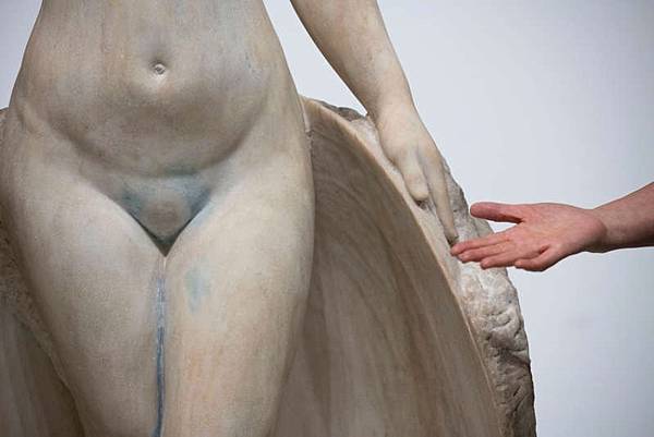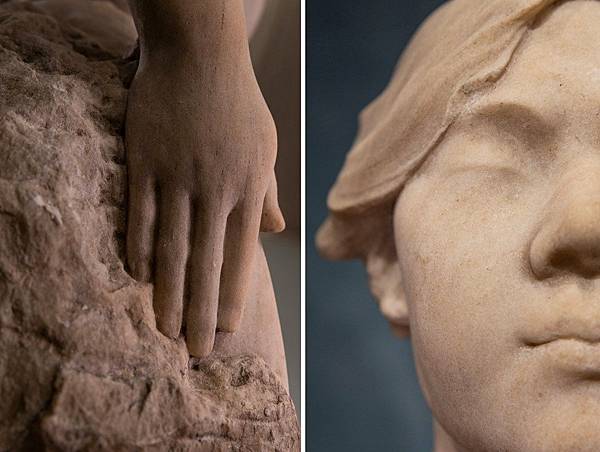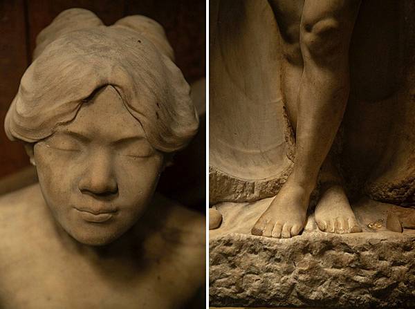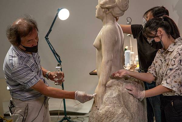 如今,只能先以大理石粉覆蓋「遮瑕」,待未來繼續研究,找出更合適的修復方式。「就黃土水自己的立場來說,在我修復的過程中,多少能感受到,我相信他應該希望觀眾看到的是一尊完整,表現出美麗女性形象的作品,而不是被藍色的墨水奪去觀者的目光吧。」森純一說,接觸雕像能感受到黃土水下手時的步驟和想法,例如等比例放大時所留下的孔洞、砥石摩擦的痕跡,都是作者獨有的手法,他要做的不是讓作品回到創作當時的質感,只是讓現在的時間凝結,不再「老去」。