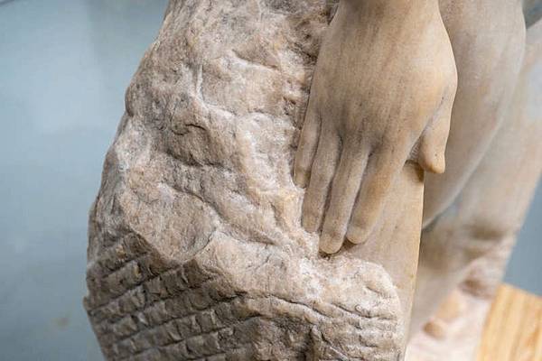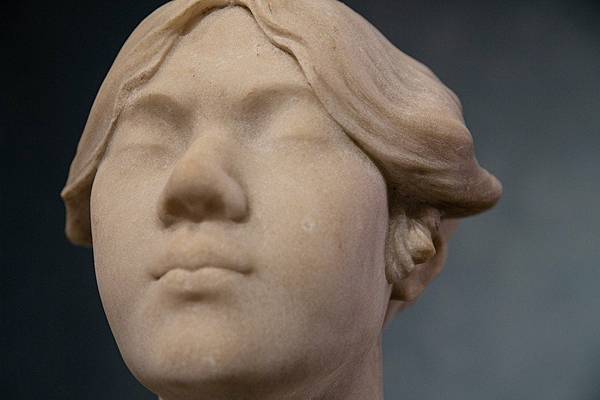 黃土水曾說,比起其他藝術創作媒材,雕刻耗費的時間常是數倍以計,經常要好幾年,甚至用上大半輩子。在《甘露水》可清晰看見他不同手法的處理,雖為大理石,女性身體的柔美和石塊的紋路呈現截然相異的質地。(攝影/林彥廷)© 報導者 黃土水曾說,比起其他藝術創作媒材,雕刻耗費的時間常是數倍以計,經常要好幾年,甚至用上大半輩子。在《甘露水》可清晰看見他不同手法的處理,雖為大理石,女性身體的柔美和石塊的紋路呈現截然相異的質地。(攝影/林彥廷)