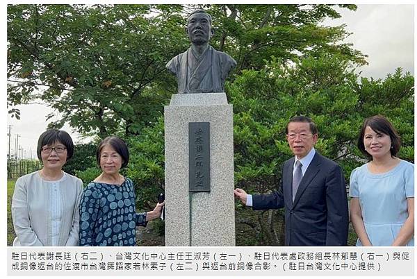 駐日代表謝長廷(右二)、台灣文化中心主任王淑芳(左一)、駐日代表處政務組長林郁慧(右一)與促成銅像返台的佐渡市台灣舞蹈家若林素子(左二)與返台前銅像合影。(駐日台灣文化中心提供)
