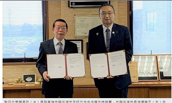駐日代表謝長廷(左)見證高雄市與佐渡市友好交流合作備忘錄簽署,並與佐渡市長渡邊龍五(右)合影。(駐日台灣文化中心提供)
