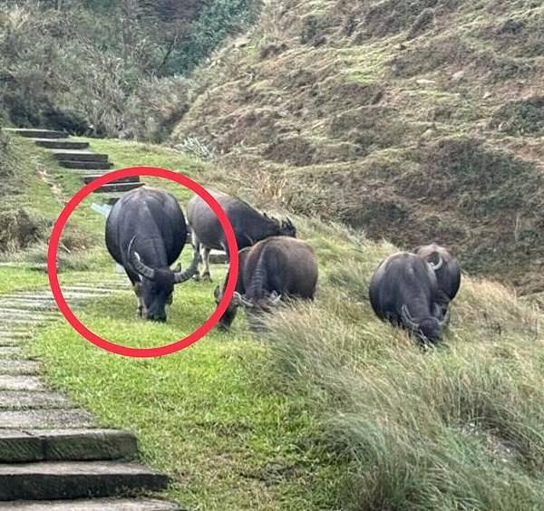 台北吳小姐到草嶺古道踏青,遭水牛從背後偷襲受傷住院,紅圈處牛隻疑為「兇手」。(圖由讀者吳小姐提供)