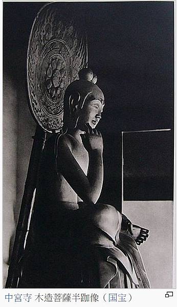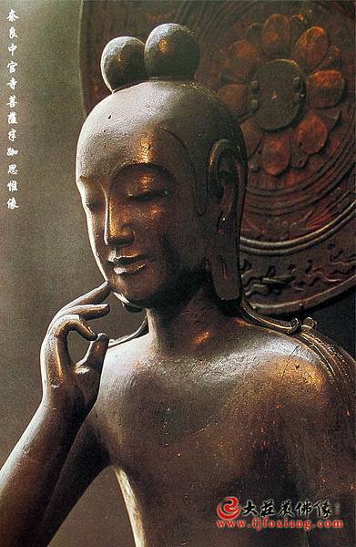 對於日本的佛像造作,不用言,是傳自於三國時代的朝鮮。然而就半跏思惟像而言,其導入的背景,比新羅時代的統一者,即當時青年貴 族集團的首領—花郎集團的指導者金庾信,被視為彌勒菩薩再現的信仰,有極密切的關係。然而就中宮寺的此尊而言,其製作時代,卻是在7世紀前半的飛鳥時代。特別是它的名稱,雖被認為與當時的聖德太子有極密切的關係,然而傳說是“ 如意輪觀音 ”的像名之說,終歸是個相當有力的證說,故此尊像稱之為菩薩半跏思惟像,實是較為中實又可信的!