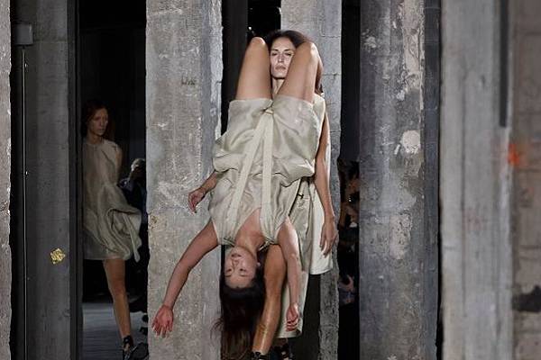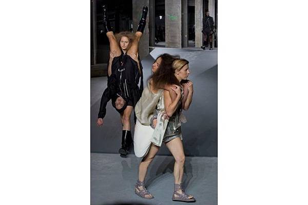 美國設計師品牌Rick Owens繼今年初舉辦2015巴黎秋冬男裝秀後,大膽在男裝的鼠蹊部位上開洞,秀出模特兒的「內在美」,震驚各界,6月舉辦春夏男裝秀時,則有男模上台時高舉「請殺了德國總理」的白布條,在昨天的巴黎春夏女裝秀上,更讓女模背著女模,或掛著一位倒吊的女模在身上,設計師發聲明闡述設計概念:「春夏女裝的靈感是從姊妹情感與母性出發,女性養育著女性,並且互相給予支持、成長。」他召集多位體操選手與舞者,搭配女模共同演繹設計靈感,表現出女性的力量。
