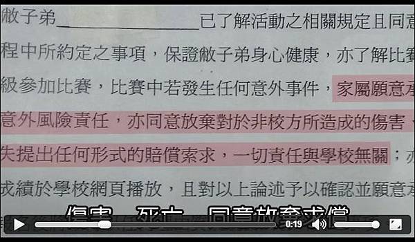 嘉義縣新港國中將舉辦國三班際籃球比賽,昨天發給參賽學生每人1張家長同意書,家長一看內容有如「生死狀」,簡而言之,如果參賽學生因比賽受傷、甚至死亡,一切概與校方無關。家長氣得向《蘋果》投訴,大罵學校舉辦活動竟然要求家長簽署這樣一張同意書,將所有責任撇得一乾二淨,這不是「生死狀」是什麼?