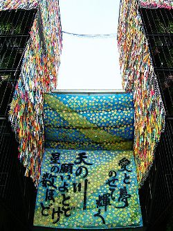 然而,日本的七夕的確熱鬧,這裡的七夕,並不是給情人們的,而是孩子的節日。這個時候,大商店往往擺開兩棵象徵性的柳樹,並給孩子們免費提供彩色的紙條。孩子們將自己的願望在紙條上寫好,再折成鳥雀的形狀穿在柳枝上。穿的紙條多了,一串串遠遠望去,就真有點兒喜鵲搭橋的味道。