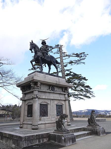 ▲仙台城天守台上的伊達政宗騎馬像。