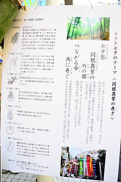 仙台七夕祭是東北夏日四大祭典之一,起源於中國古老的神話傳說「牛郎與織女」;最早,仙台藩的婦女為了求得像織女般巧手的紡織技術,開始祭拜牛郎與織女,之後,仙台藩的領主伊達政宗為了獎勵婦女,而提倡七夕祭。經過後世人們不斷的擴大規模與發展,演變成為今日的仙台熱鬧唯美的七夕祭典。