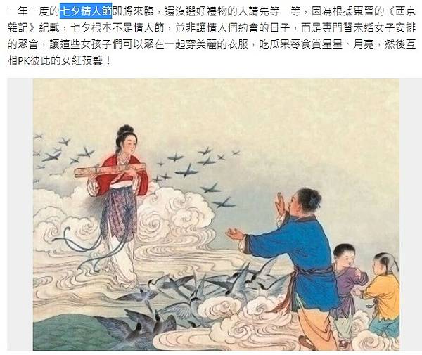 一年一度的七夕情人節即將來臨,還沒選好禮物的人請先等一等,因為根據東晉的《西京雜記》紀載,七夕根本不是情人節,並非讓情人們約會的日子,而是專門替未婚女子安排的聚會,讓這些女孩子們可以聚在一起穿美麗的衣服,吃瓜果零食賞星星、月亮,然後互相PK彼此的女紅技藝!
