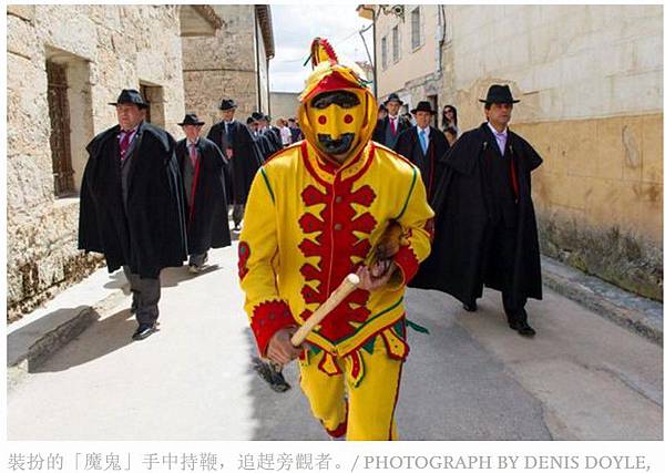 「惡魔」(Colacho)每年都會穿著亮黃色服裝,手持鞭子與木棍在村莊裡狂奔,攻擊、謾罵路上的村民,而拯救村民的救世主「黑衣人」(black-clad atabalero)會隨著鼓聲出現與惡魔搏鬥。