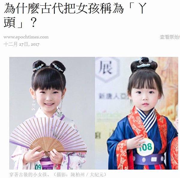 古代「丫頭」一詞,最初並非用來代稱女孩,而是專指幼童頭梳丫髻的髮式。如唐朝劉禹錫《樂天寄憶舊遊因作報白君以答》詩:「丫頭小兒蕩畫槳,長袂女郎簪翠翹。」又宋朝楊萬里《入建平界》詩:「溧水南頭接建平,丫頭兒子便勤耕。」古代不只是女孩兒梳雙髻髮式,男孩兒也都將頭髮編扎成兩束,盤在頭頂左右兩側,因形狀類似獸的兩隻角,故稱為「總角」,後來被用來代指未成年男女。如《詩經‧齊風‧甫田》:「婉兮孌兮,總角丱兮。」