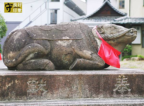 走在北野天滿宮寬闊的參道上,羅列的石燈籠中交雜著不少體態各異的臥牛塑像;這些牛隻泰然自若地坐臥一隅,肥壯的牛頸上披著鮮豔的紅色圍兜,樣貌十分討喜。
