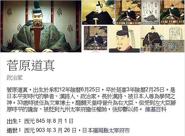 菅原道真(845年8月1日-903年3月26日),出生於承和12年陰曆6月25日(845年8月1日),卒於延喜3年陰曆2月25日(903年3月26日)。是日本平安時代的學者、漢詩人、政治家。長於漢詩、被日本人尊為學問之神(相對地,日本傳統文化中的武神則是坂上田村麻呂)。33歳時被任為文章博士。醍醐天皇時晉升為右大臣、但受到左大臣藤原時平的讒言、被貶到九州太宰府擔任權帥(太宰府副統帥),後抑鬱以終。