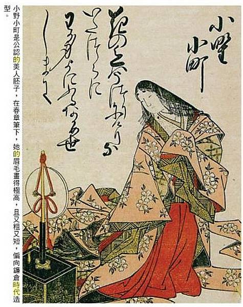 後來皇帝駕崩了,小野小町離開深宮,對所有求婚者都未有動過心。當時的日本開放風氣和唐代可比擬,另一著名才女清少納言就曾結婚兩次、離婚兩次!於是盛傳小町本人對男人無興趣皆因她是個「石女」-至今,在日語裡繡花針的洞太小線穿不過的都叫小町針,多麼低級的惡趣味!