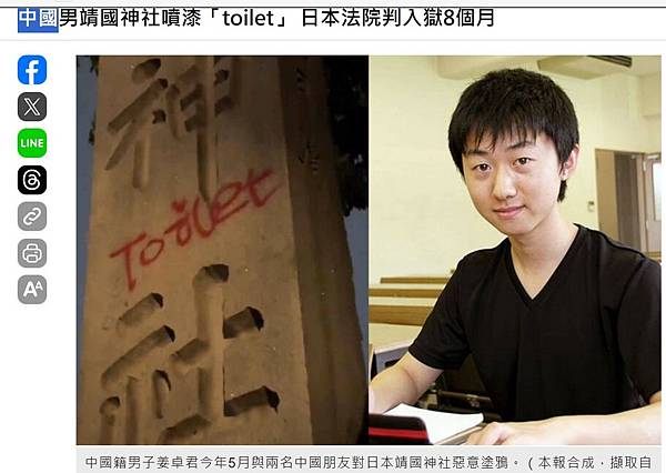 中國男靖國神社噴漆「toilet」 日本法院判入獄8個月 - 國際 - 自由時報電子報 https://bit.ly/428Cp7d