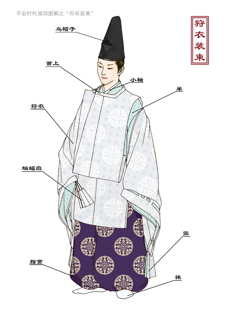 “狩衣裝束”。從字面上就可以看出,“狩衣”是一種獵裝裝束,原來是用在打獵的時候穿著的裝束,也在旅行、散步、玩蹴鞠遊戲時穿著;後來作為貴族公卿的私服,同時也是武家和下等官員(這裡指的是六位以下的官員)的正式禮服的禮服。