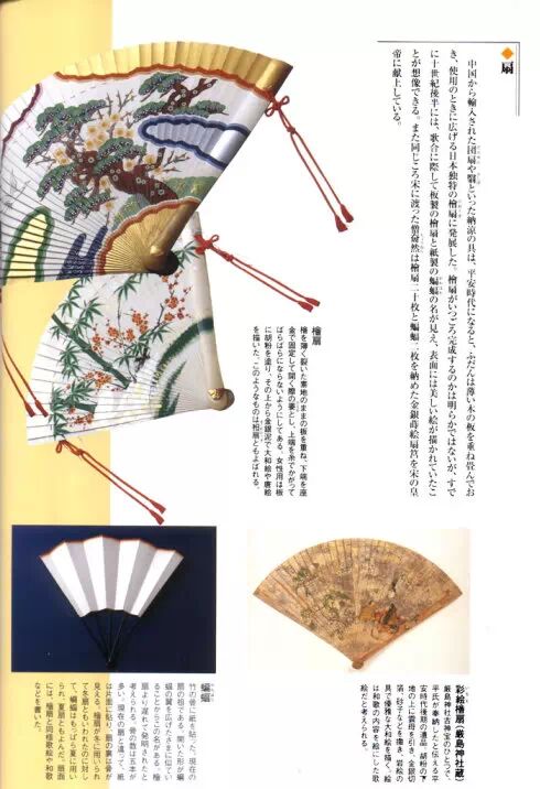 最後,還要介紹一下女房裝束的飾物:衵扇。它由杉木或檜木製成,其上覆有薄紙,施以彩繪,又用金銀為箔,是一種非常華美的扇子。